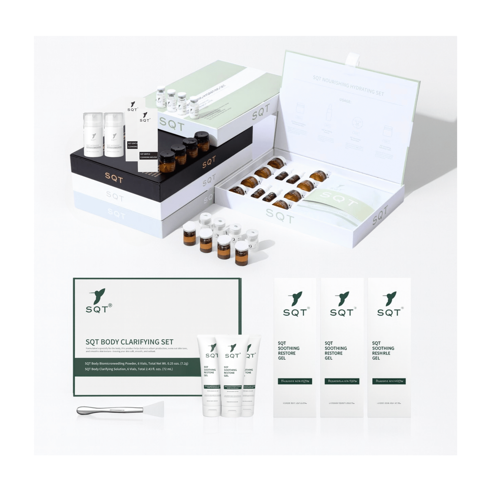 🟢 SQT® RESURFACING Repair Set: Regeneración profunda y renovación celular. 🟢 1 SQT® REVITALIZING Beauty Set: Potencia luminosidad y vitalidad. 🟢 1 SQT® NOURISHING Set: Nutrición intensiva para una piel saludable. 🟢 1 SQT® ANTIAGING Set: Combate signos visibles del envejecimiento. 🟢 2 SQT® RECOVERY Set: Favorece recuperación óptima tras tratamiento. 🟢 4 GENTLE CLEANSING FOAM: Limpieza profunda y delicada. 🟢 5 ADVANCED REPAIR MASK: Regeneración avanzada y efecto calmante. 🟢 4 INTENSE RESTORATIVE CREAM: Hidratación intensa y reparación profunda.